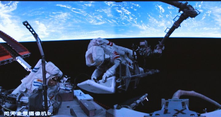 ??这是2025年6月26日在北京航天飞行控制中心屏幕上拍摄的神舟二十号航天员陈冬(左)与陈中瑞在空间站组合体舱外工作的画面。新华社发(周柯毅摄)